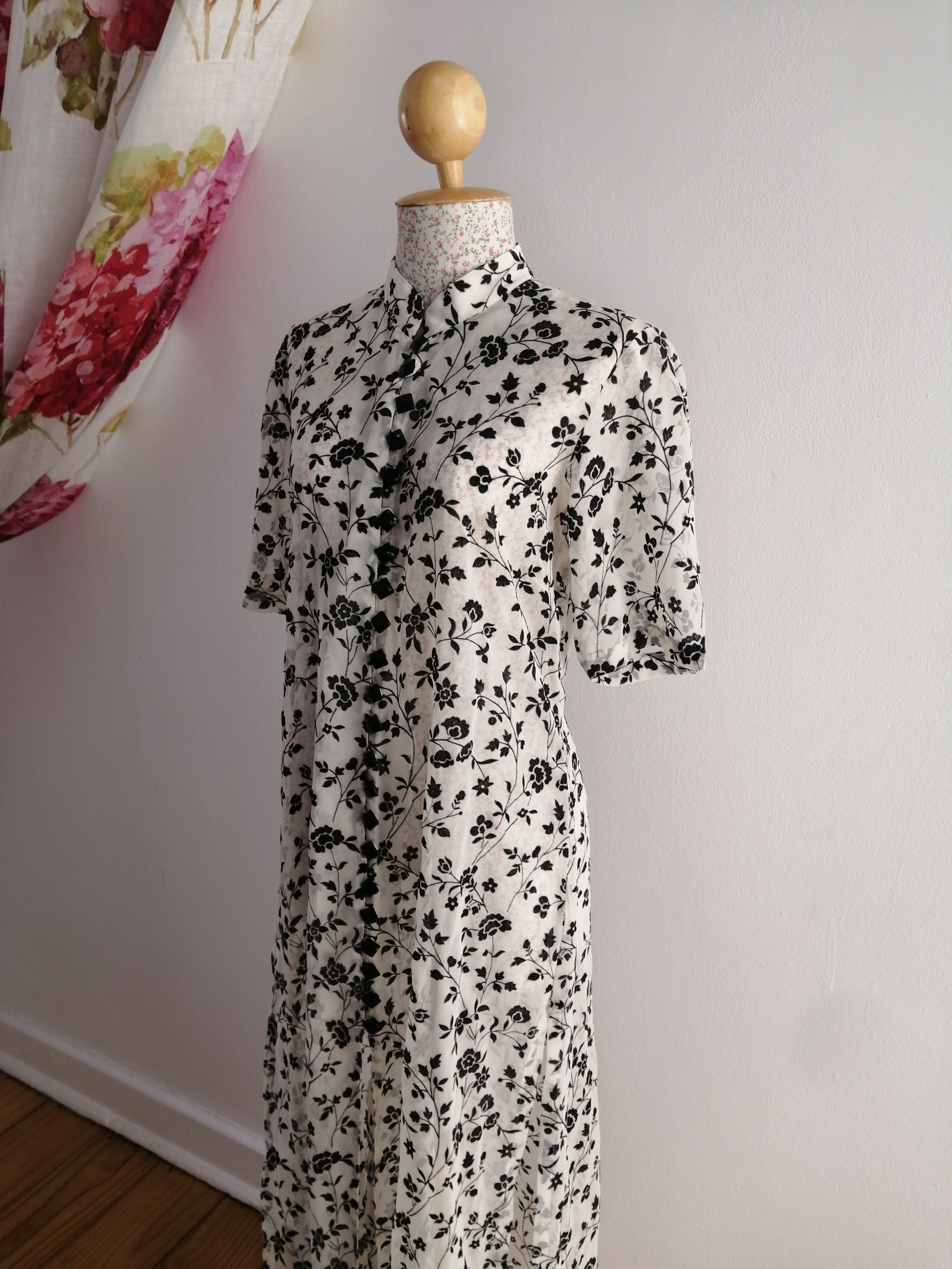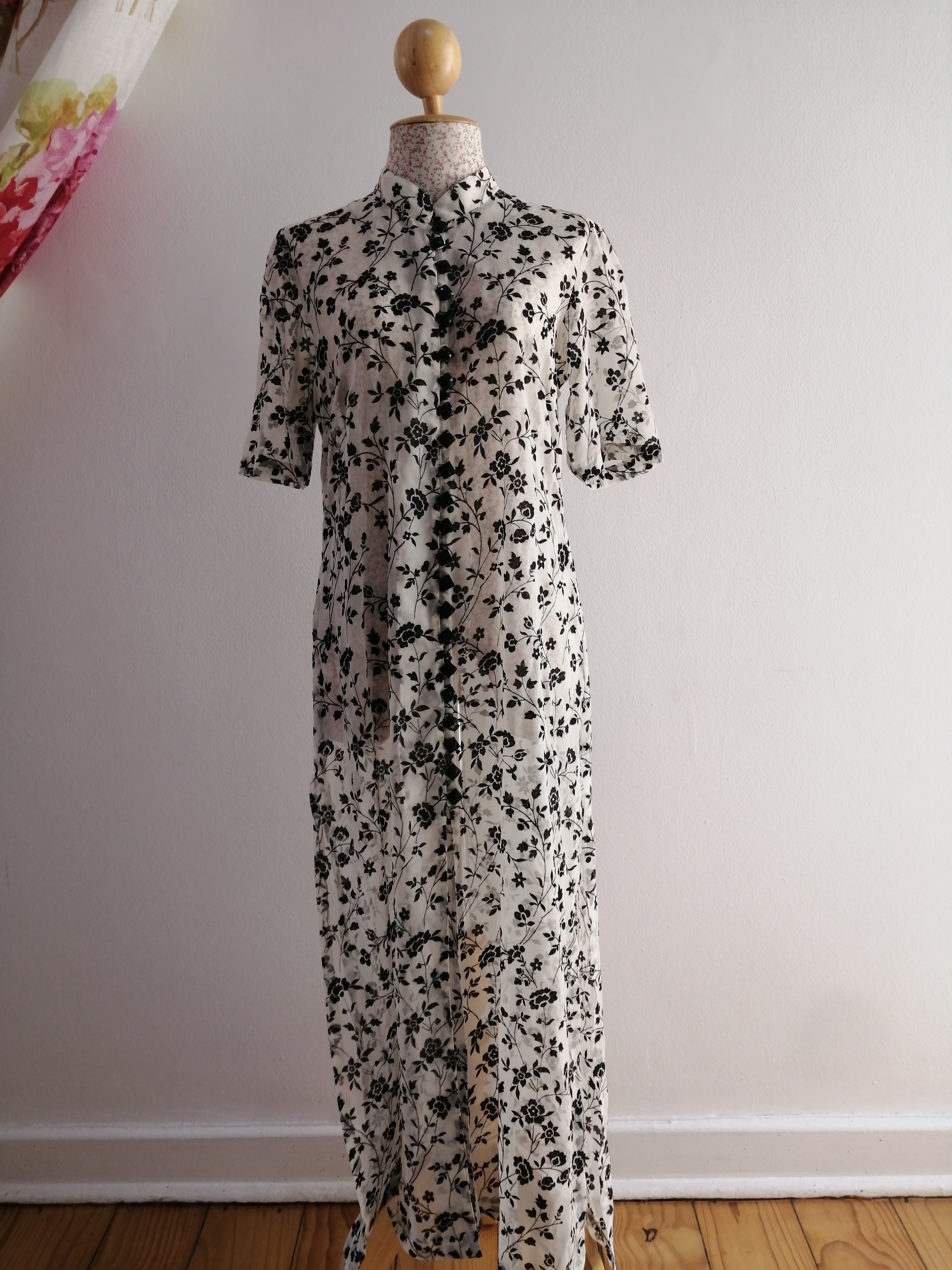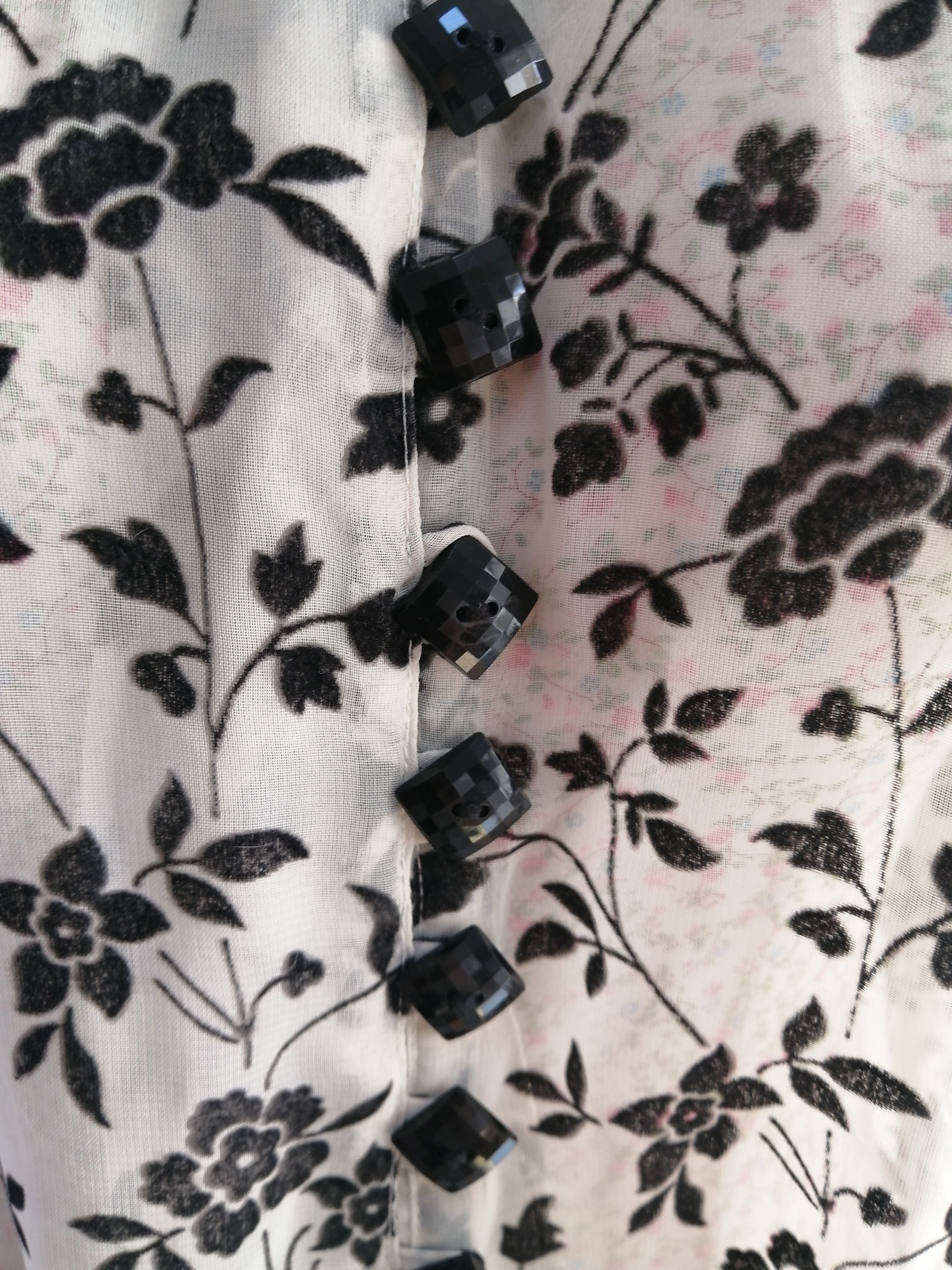 Slip into effortless elegance with this stunning sheer long dress that's equal parts romantic and bold. Featuring a mandarin collar, delicate black floral pattern, and a charming row of square buttons running down the front, it's the perfect piece for layering or going bare underneath for maximum drama. Twirl with confidence in this timeless silhouette that works just as well at brunch as it does at sunset soirées.