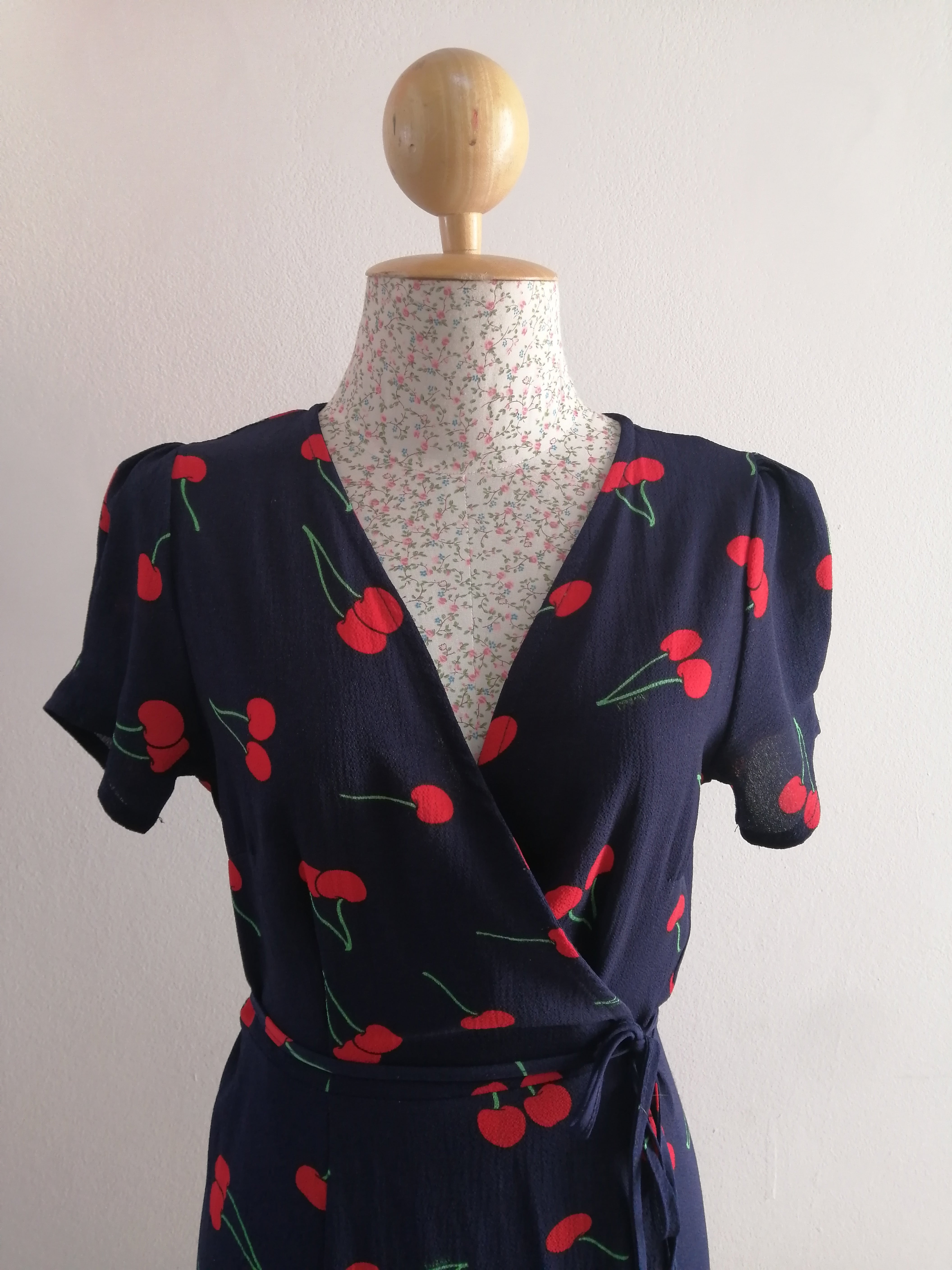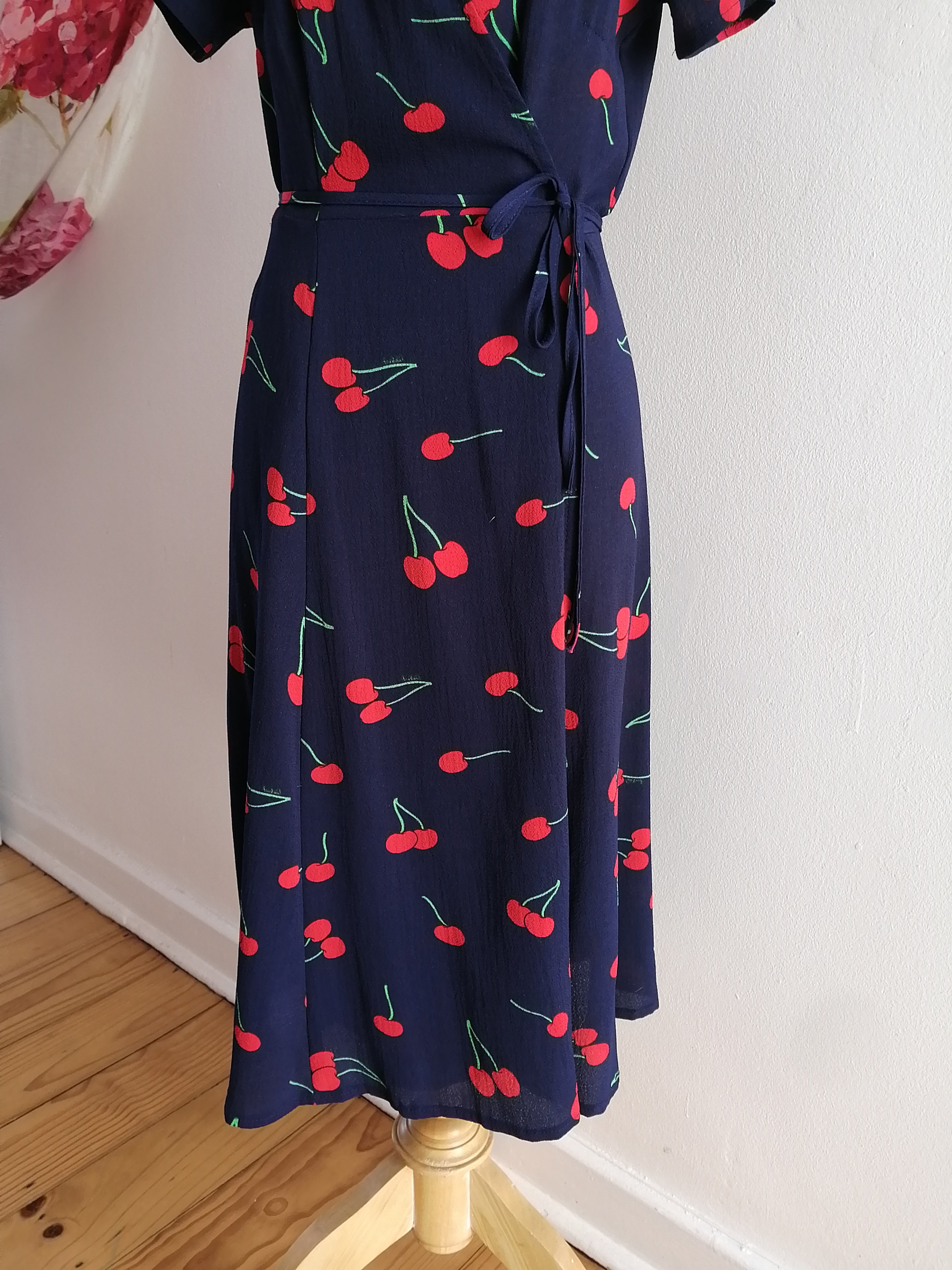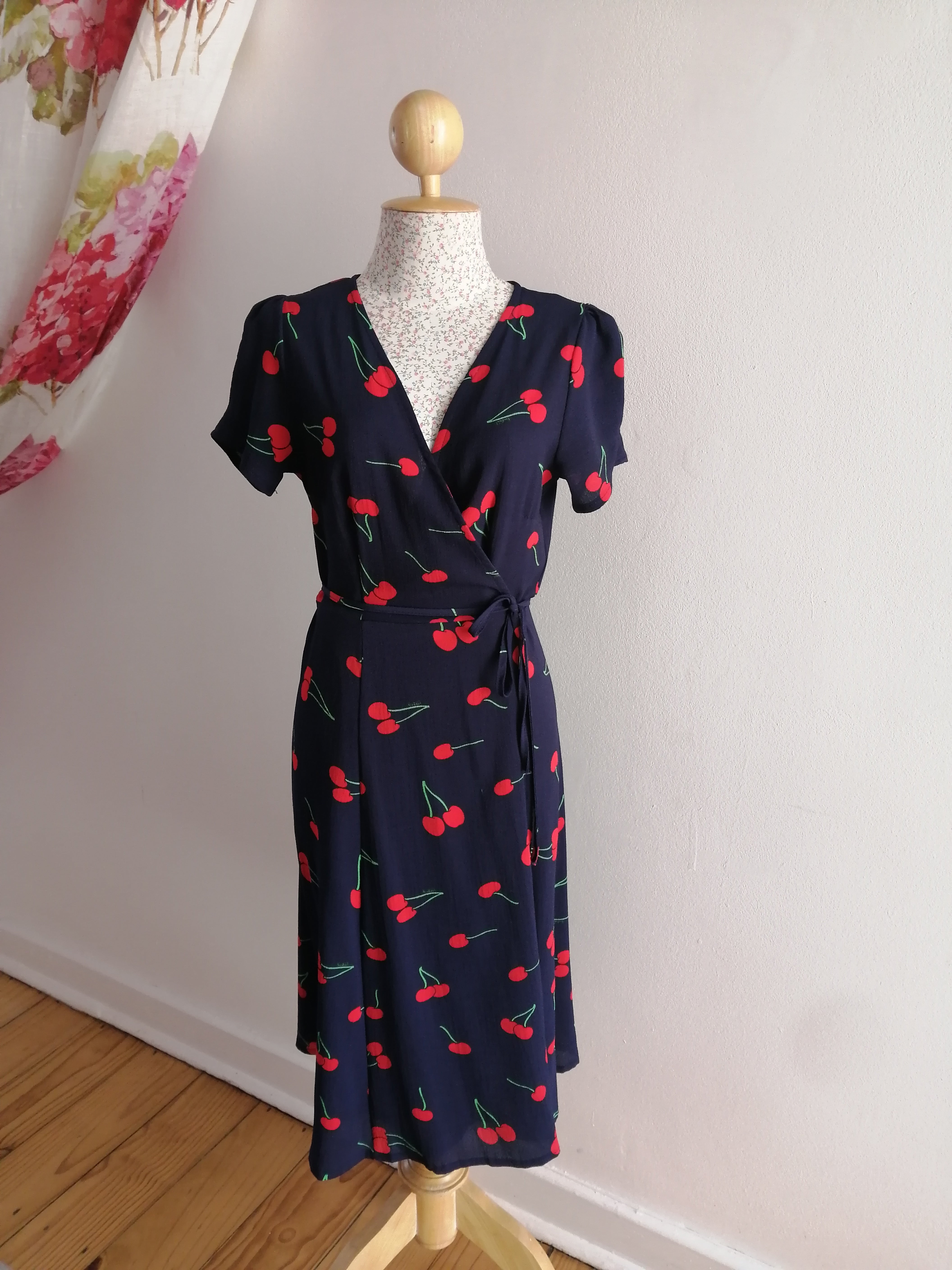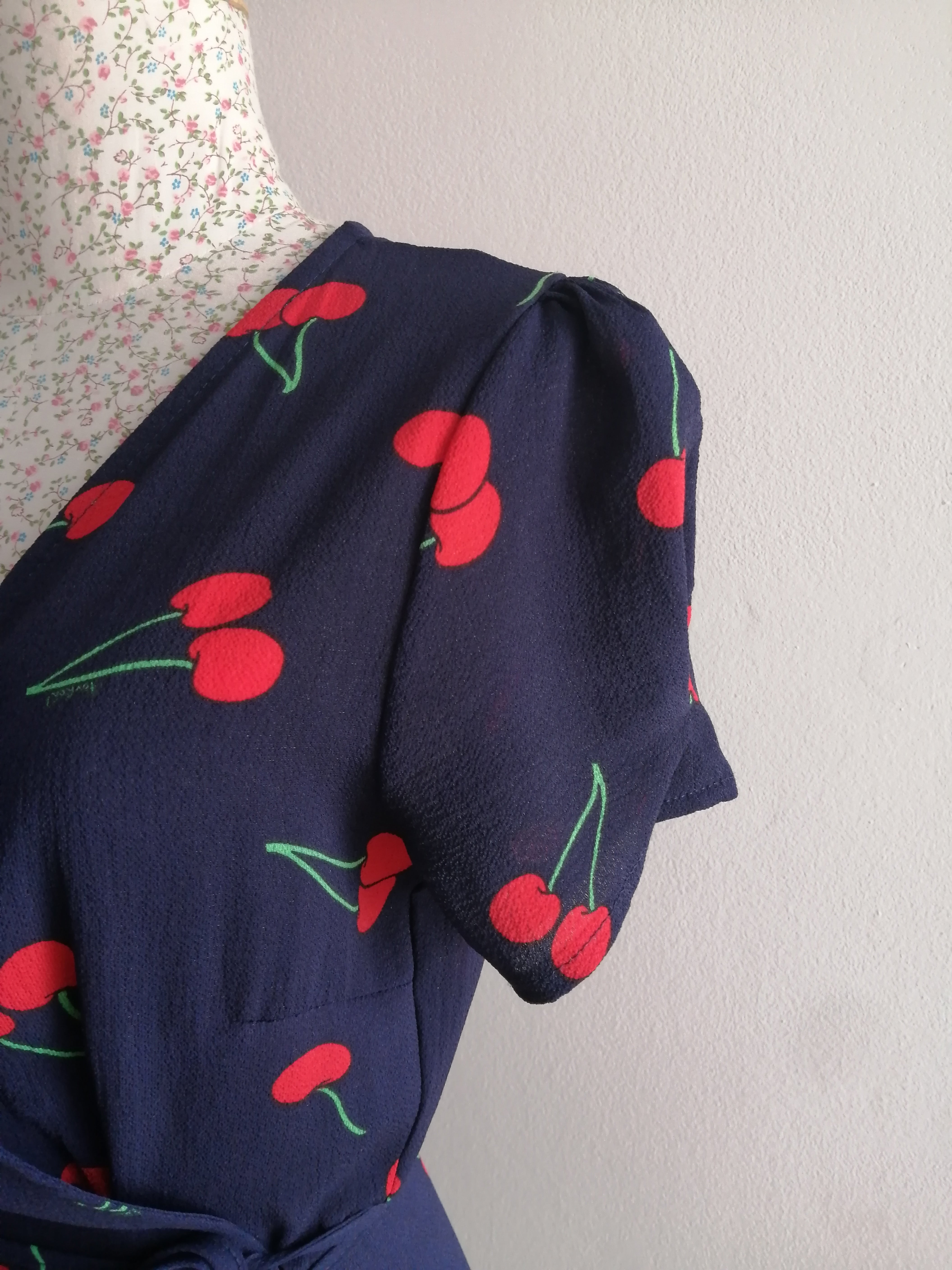 Wrap yourself in charm with this delightful navy dress adorned with cheerful cherry prints. The classic wrap silhouette flatters every figure while the playful cherry design adds a touch of whimsy to your everyday style. Perfect for those who love vintage-inspired fashion with a fun twist. Dress it up or down—this versatile piece is ready for whatever your day brings!