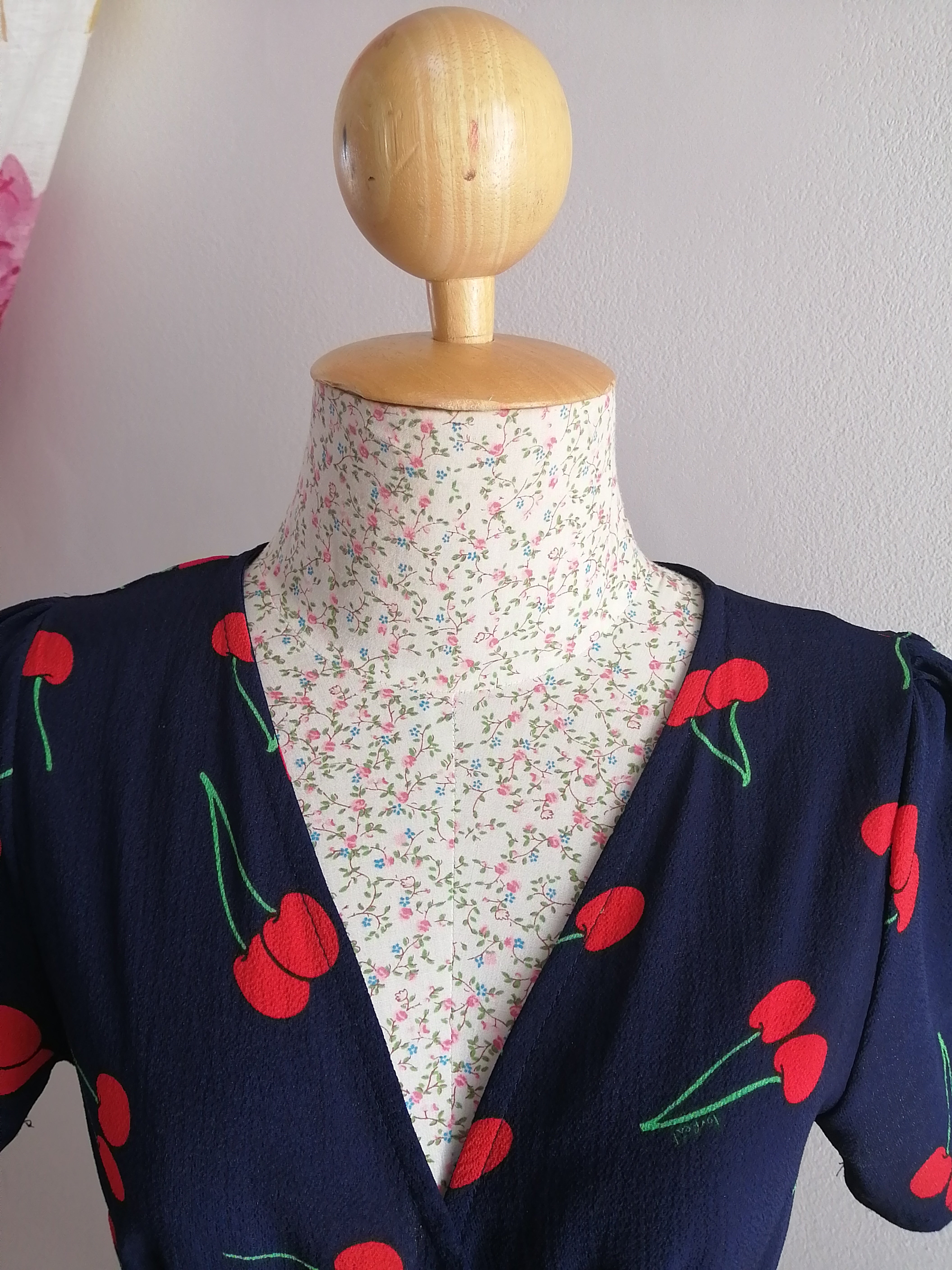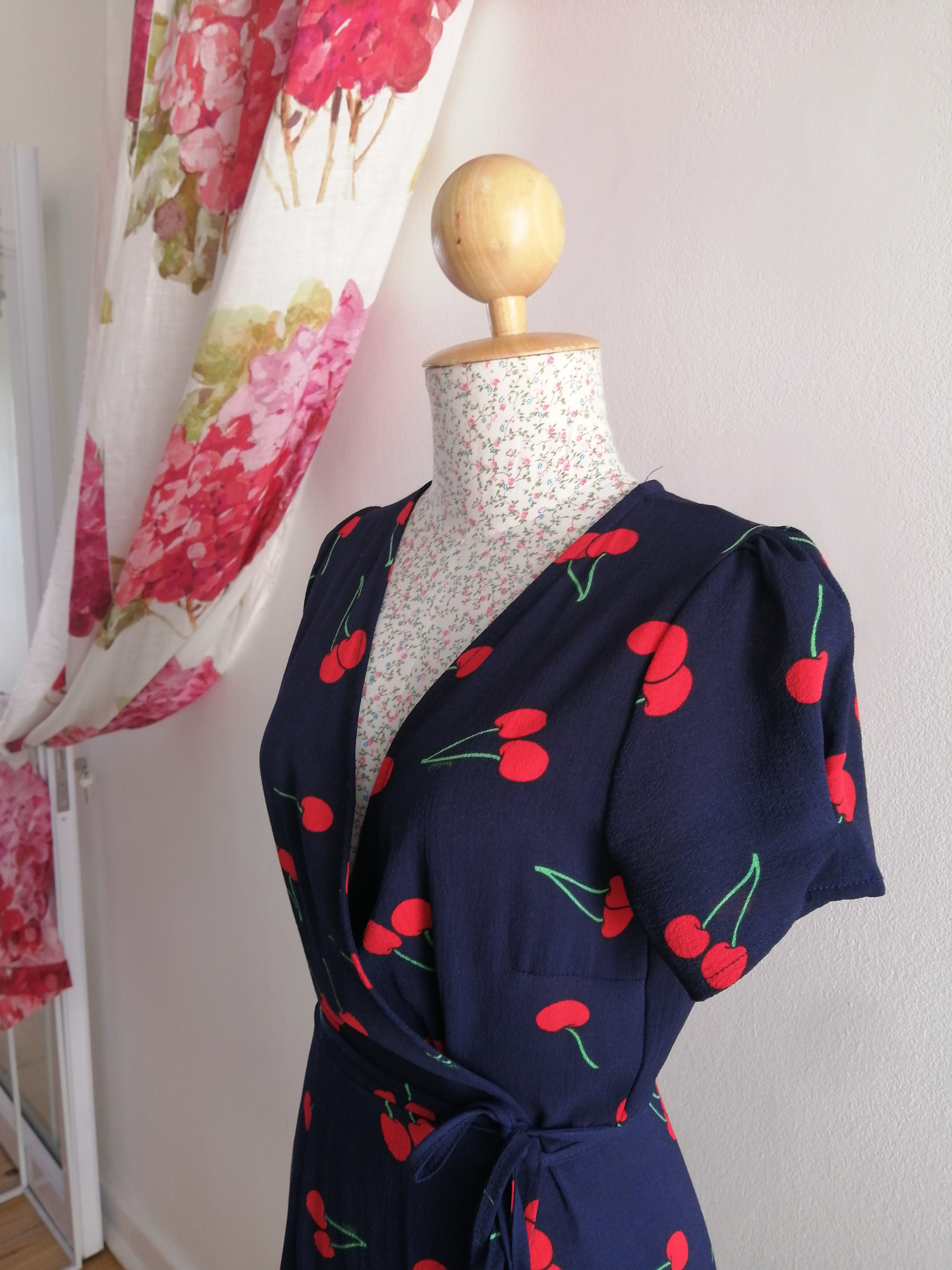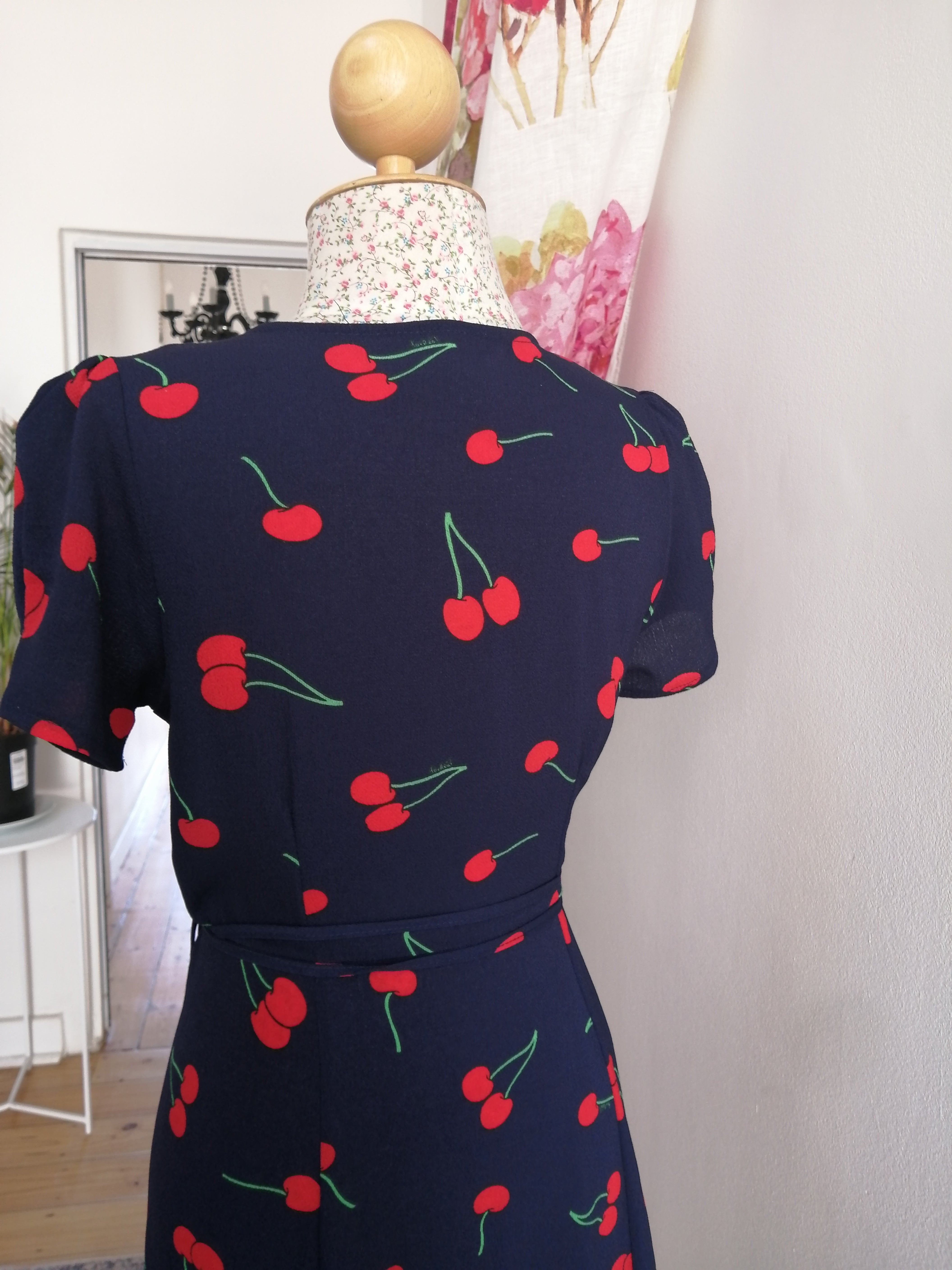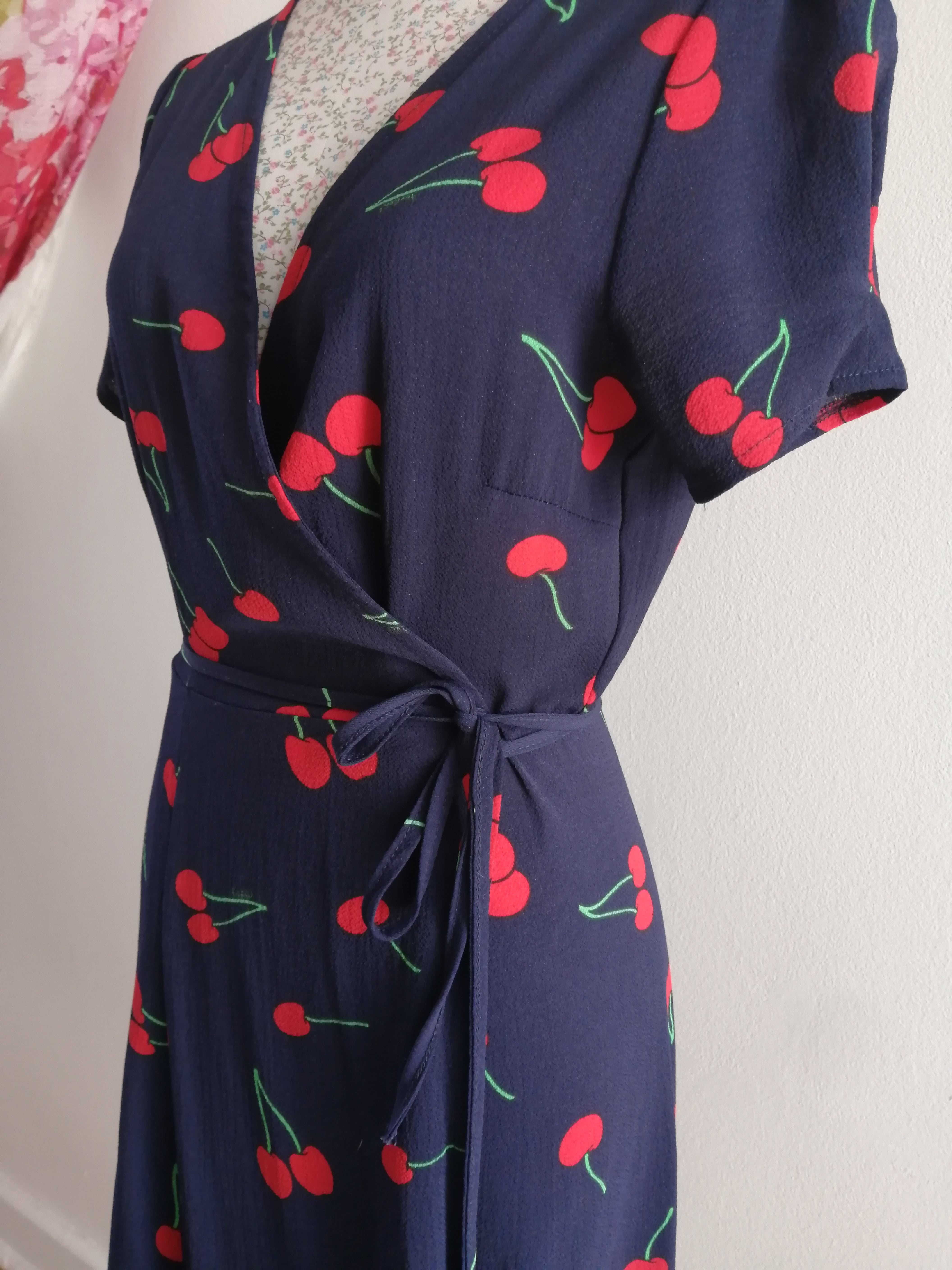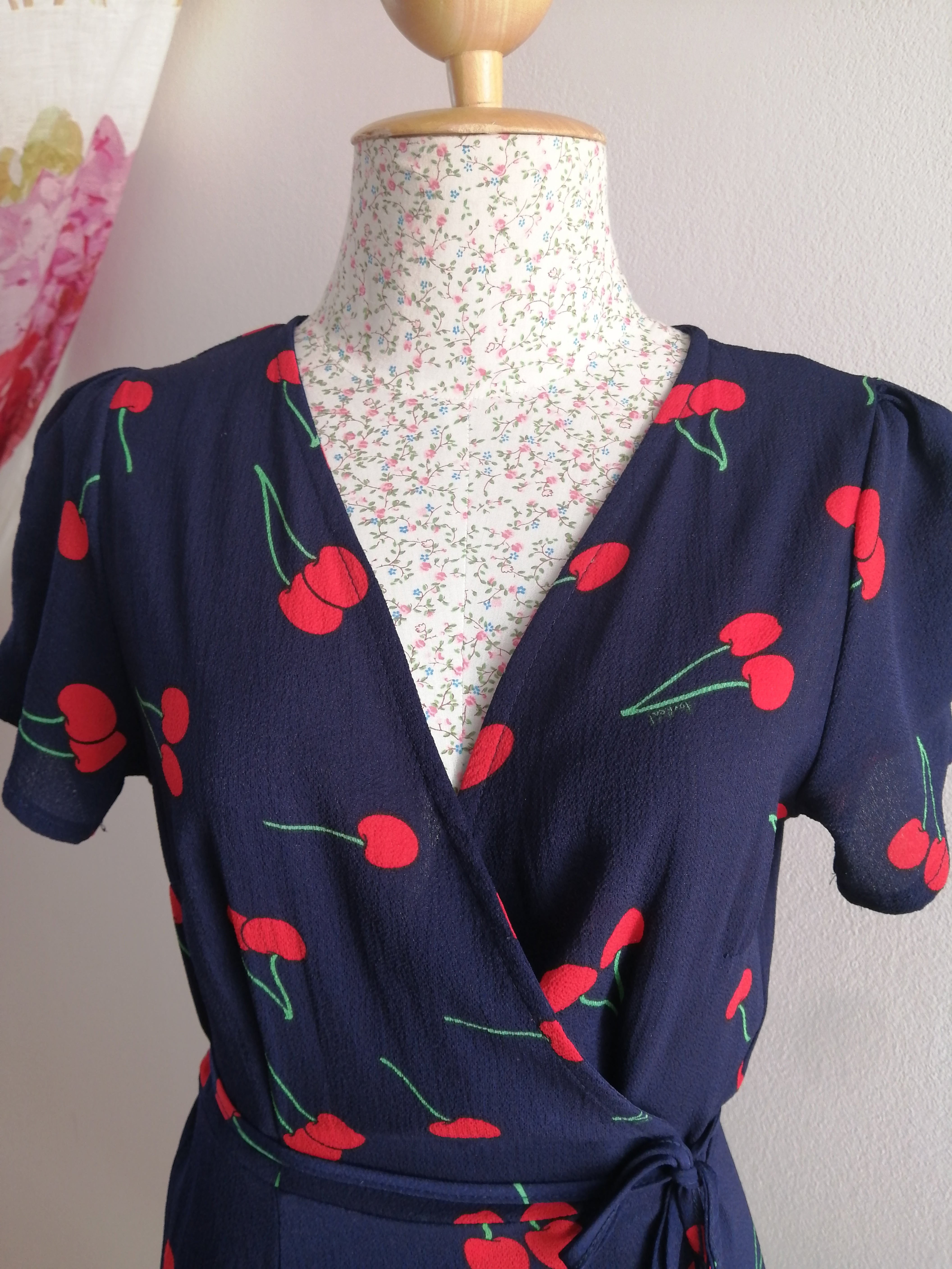 Wrap yourself in charm with this delightful navy dress adorned with cheerful cherry prints. The classic wrap silhouette flatters every figure while the playful cherry design adds a touch of whimsy to your everyday style. Perfect for those who love vintage-inspired fashion with a fun twist. Dress it up or down—this versatile piece is ready for whatever your day brings!