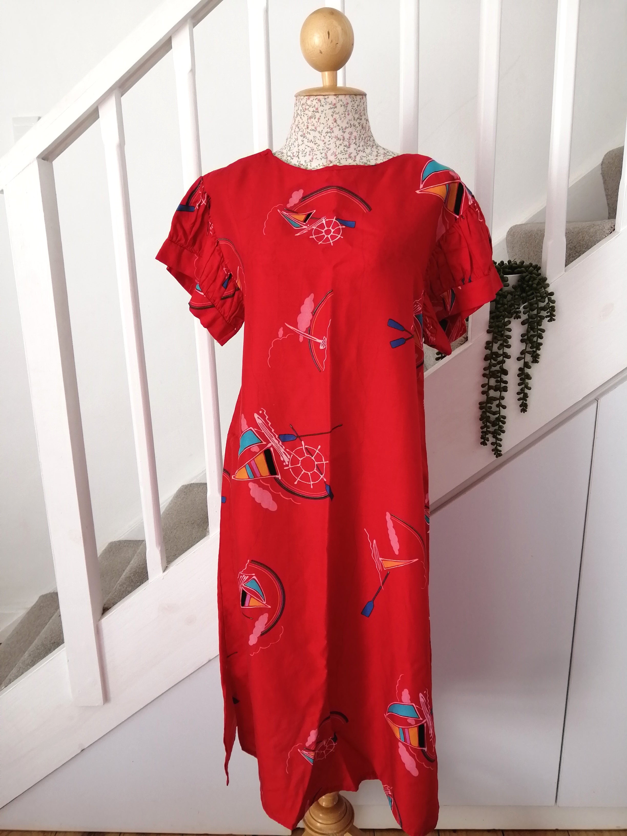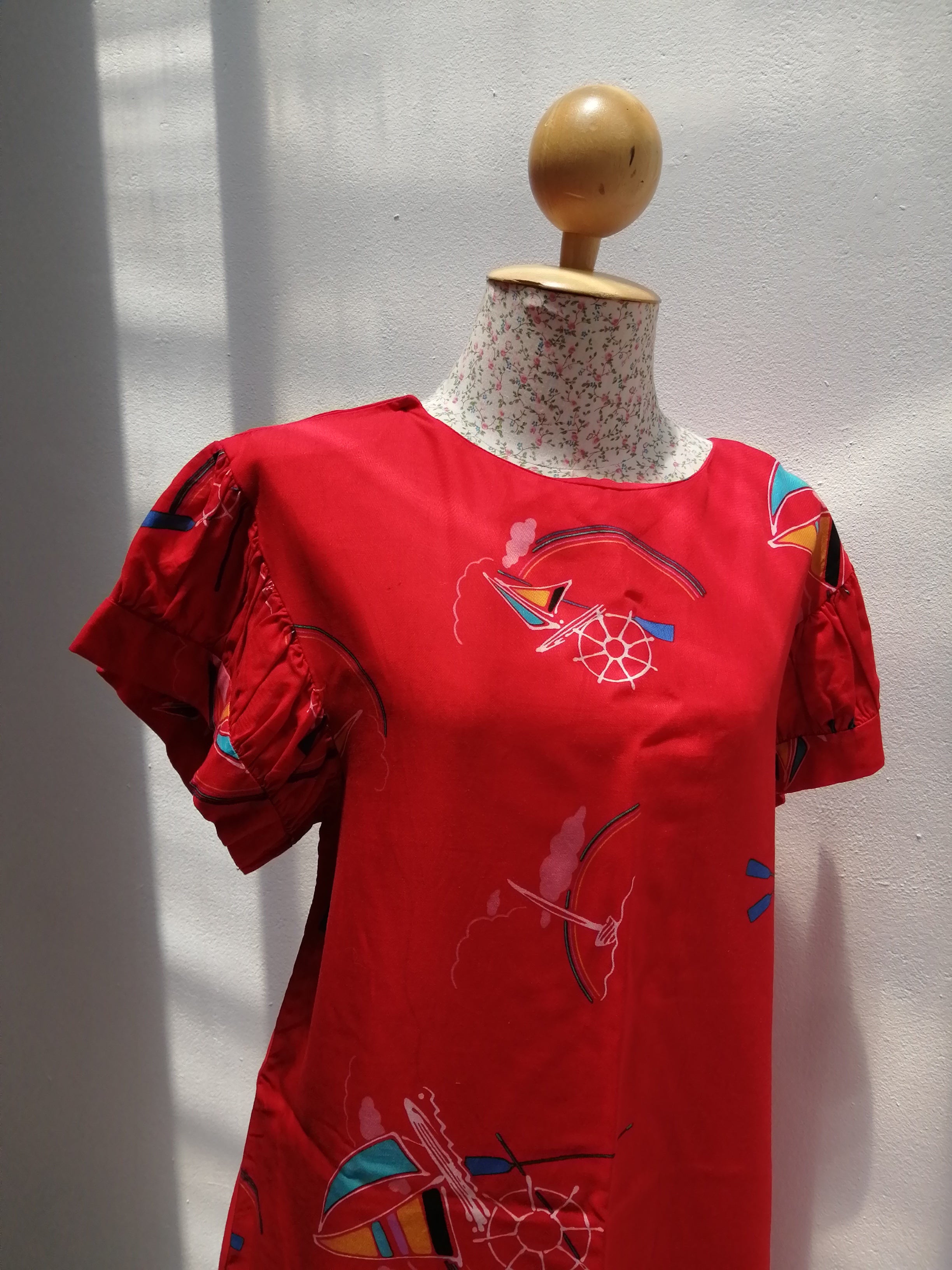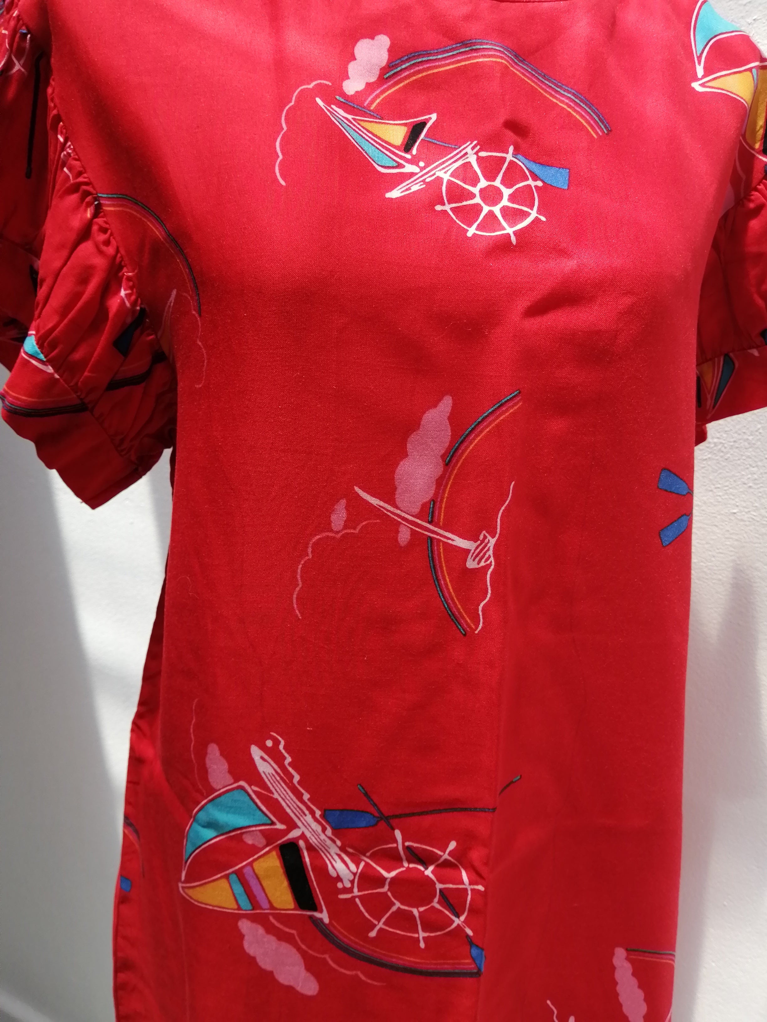 This red dress features charming playful prints and adorable puffy sleeves that add a touch of whimsy to your look. It's fun design and comfortable fit make it perfect for brightening up any day.