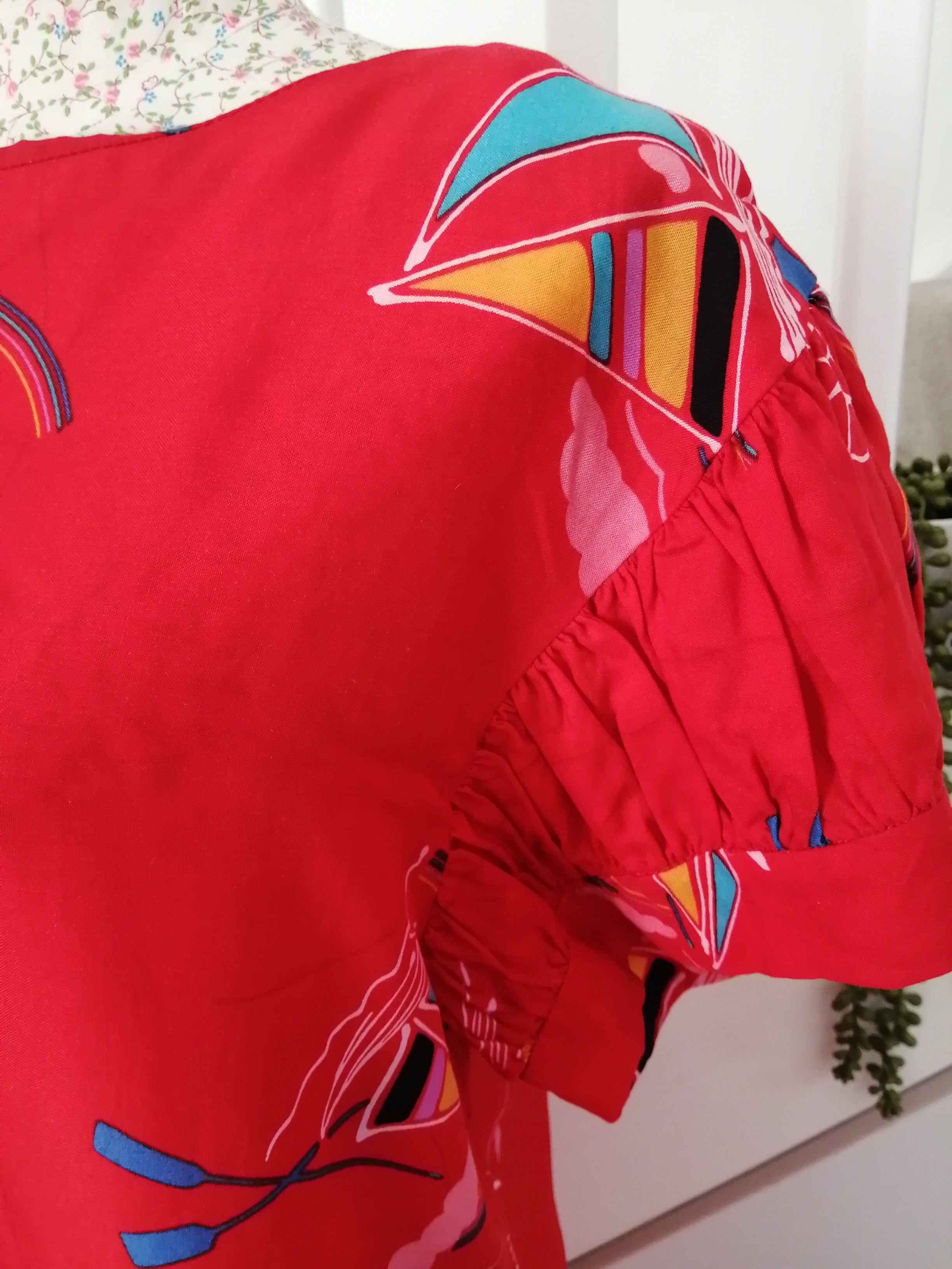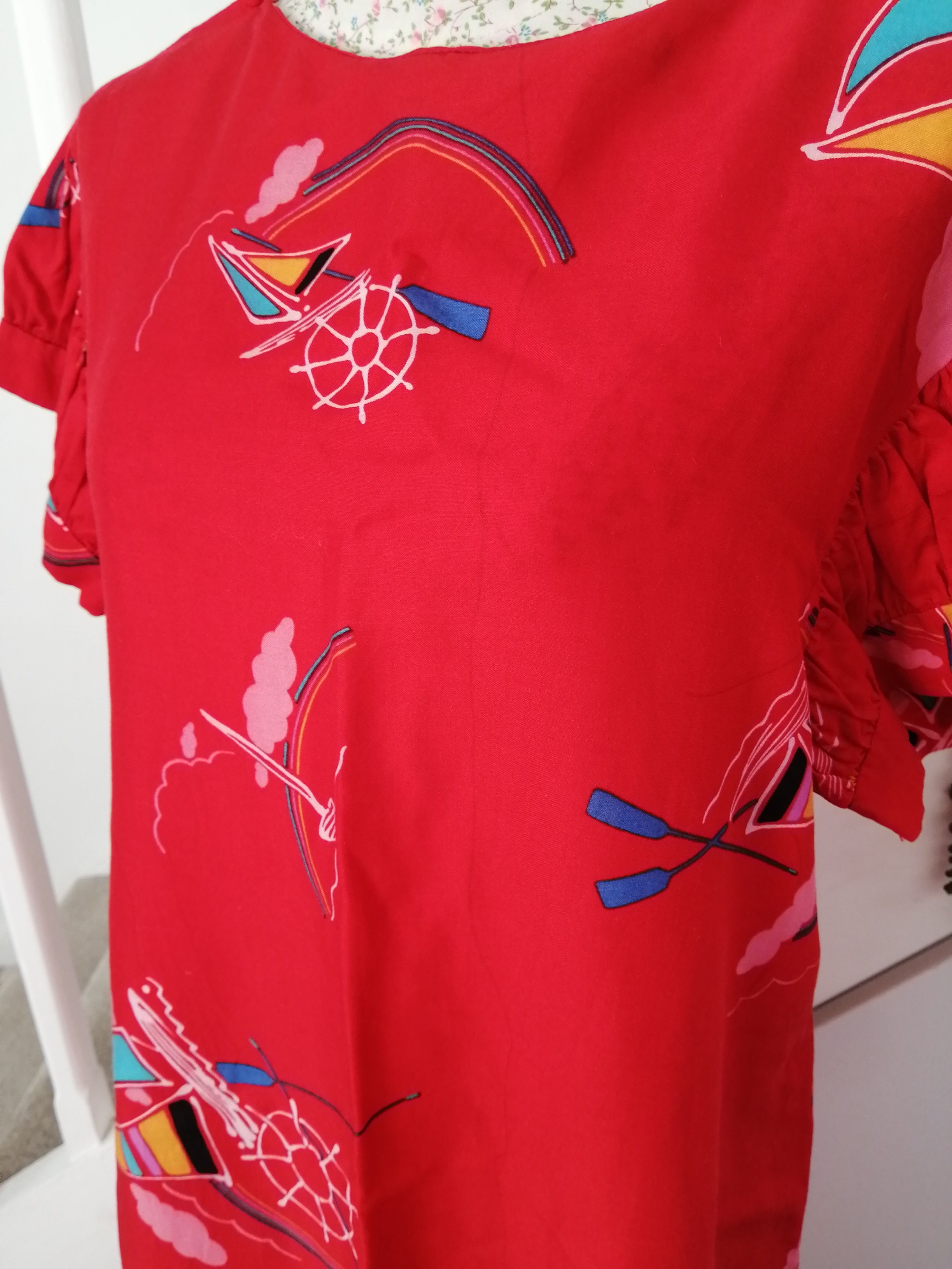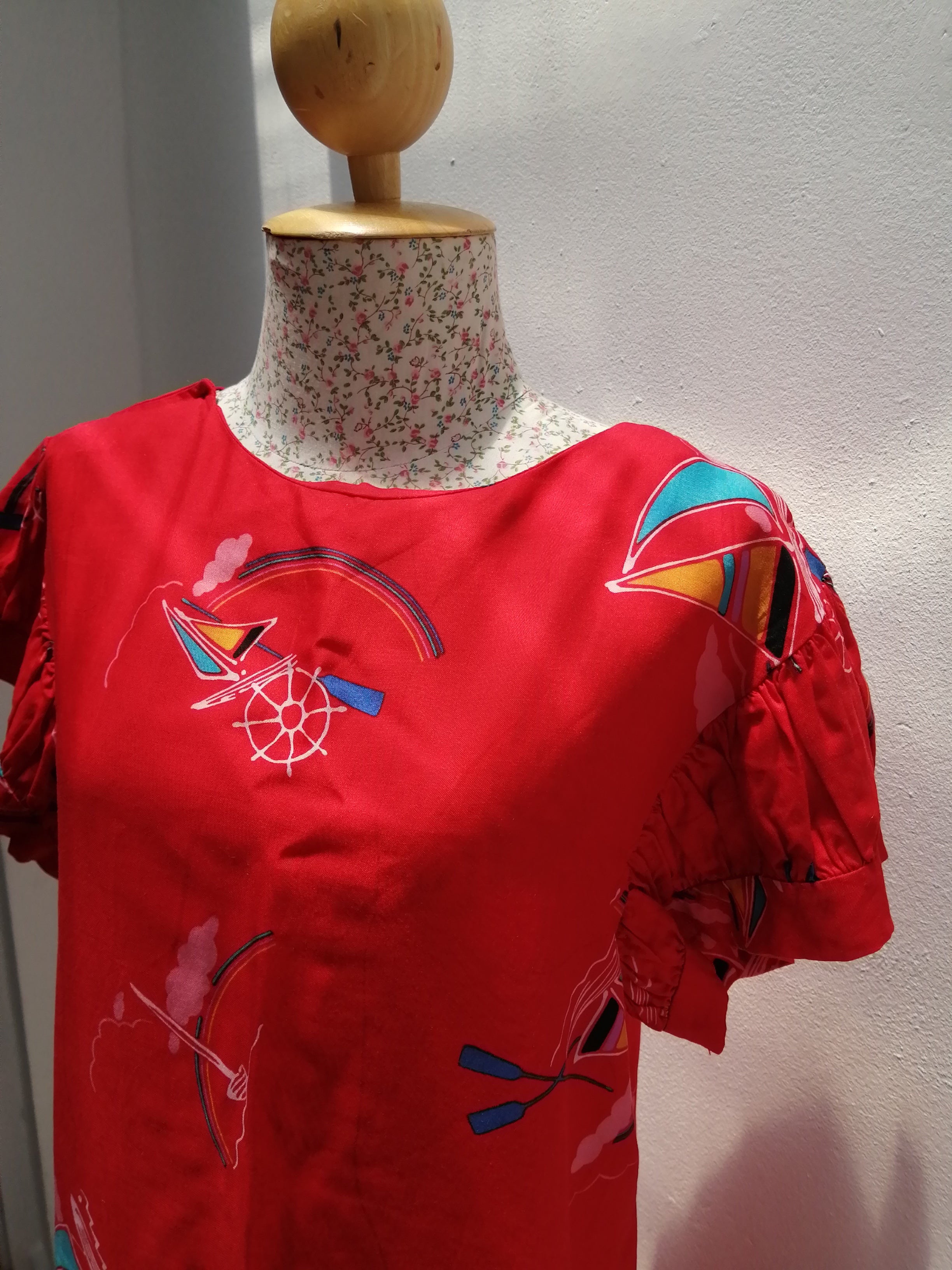 This red dress features charming playful prints and adorable puffy sleeves that add a touch of whimsy to your look. It's fun design and comfortable fit make it perfect for brightening up any day.